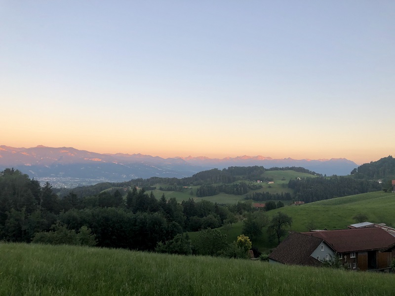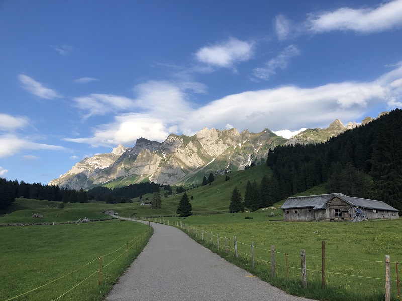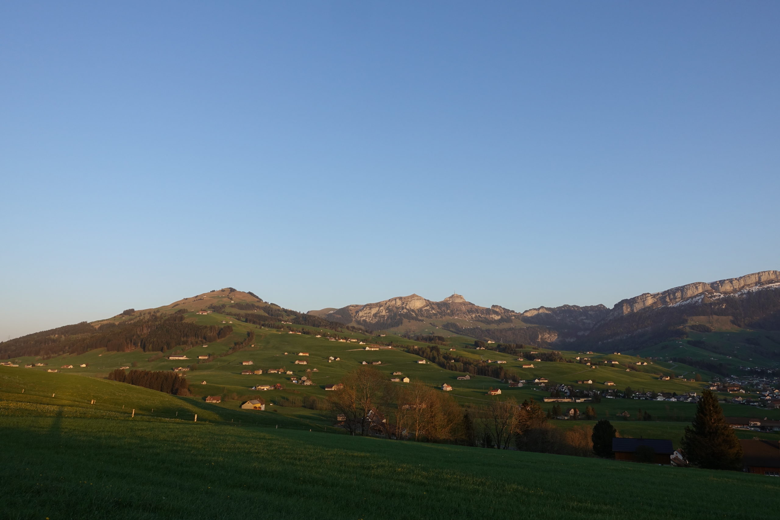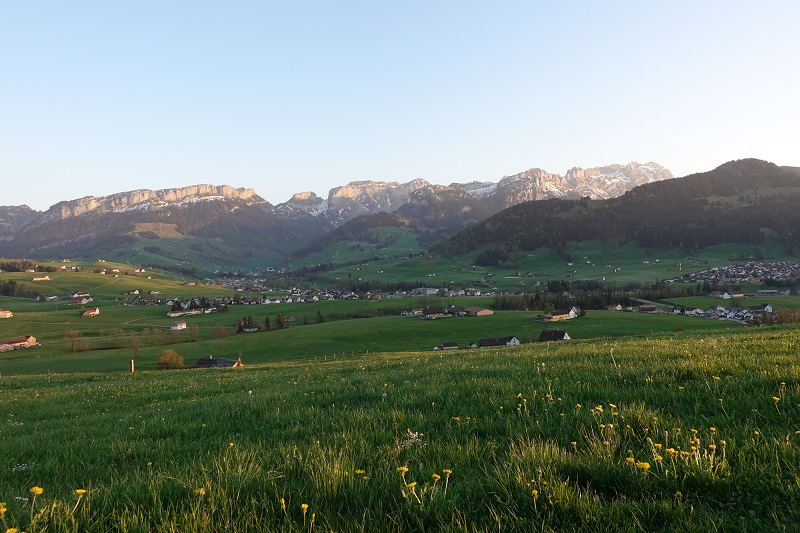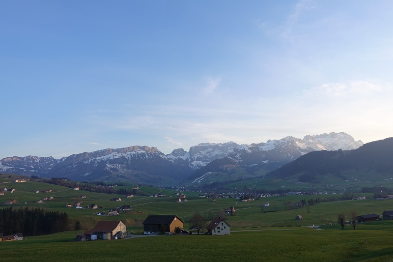 Sanfte, grüne Wiesen, Hügel, kleinen Siedlungen, im Norden begrenzt durch den Bodensee, im Süden vom mächtigen Alpstein: das Appenzellerland. Laut einer Sage begab sich der Riese Säntis vom Alpstein hinab ins Tal und sammelte in seinem riesigen Sack viele kleine Häuser und Siedlungen. Darunter auch einen Bauer, der beim Versuch, sich zu befreien, mit der Sense einen tiefen Schnitt im Sack hinterlies. Auf dem Weg zurück auf die Meglisalp, baumelte der Sack hin und her und verstreute die Häuser im ganzen Land. Soviel zur Entstehungsgeschichte der wunderbaren Landschaft. Es macht Spaß, sich bei der Fahrt durch die hügelige Landschaft vorzustellen, wie ein Riese Häuser verstreut hat.